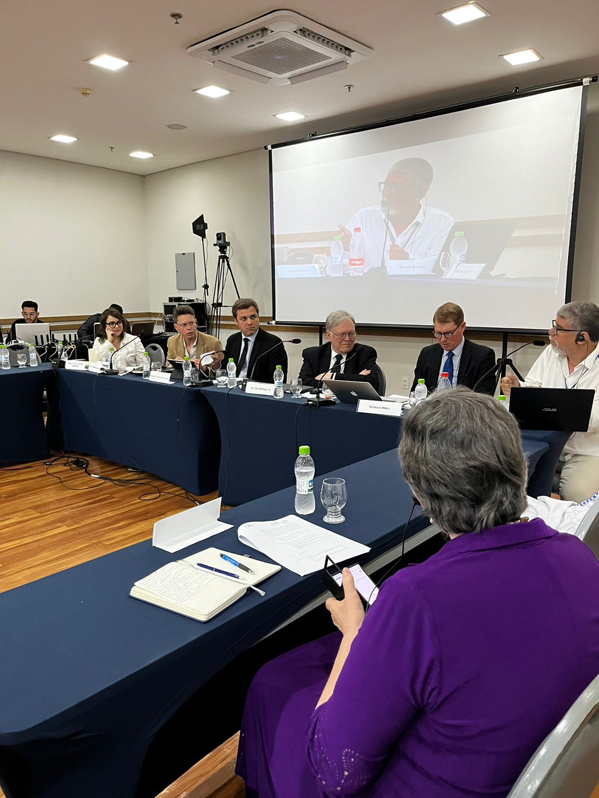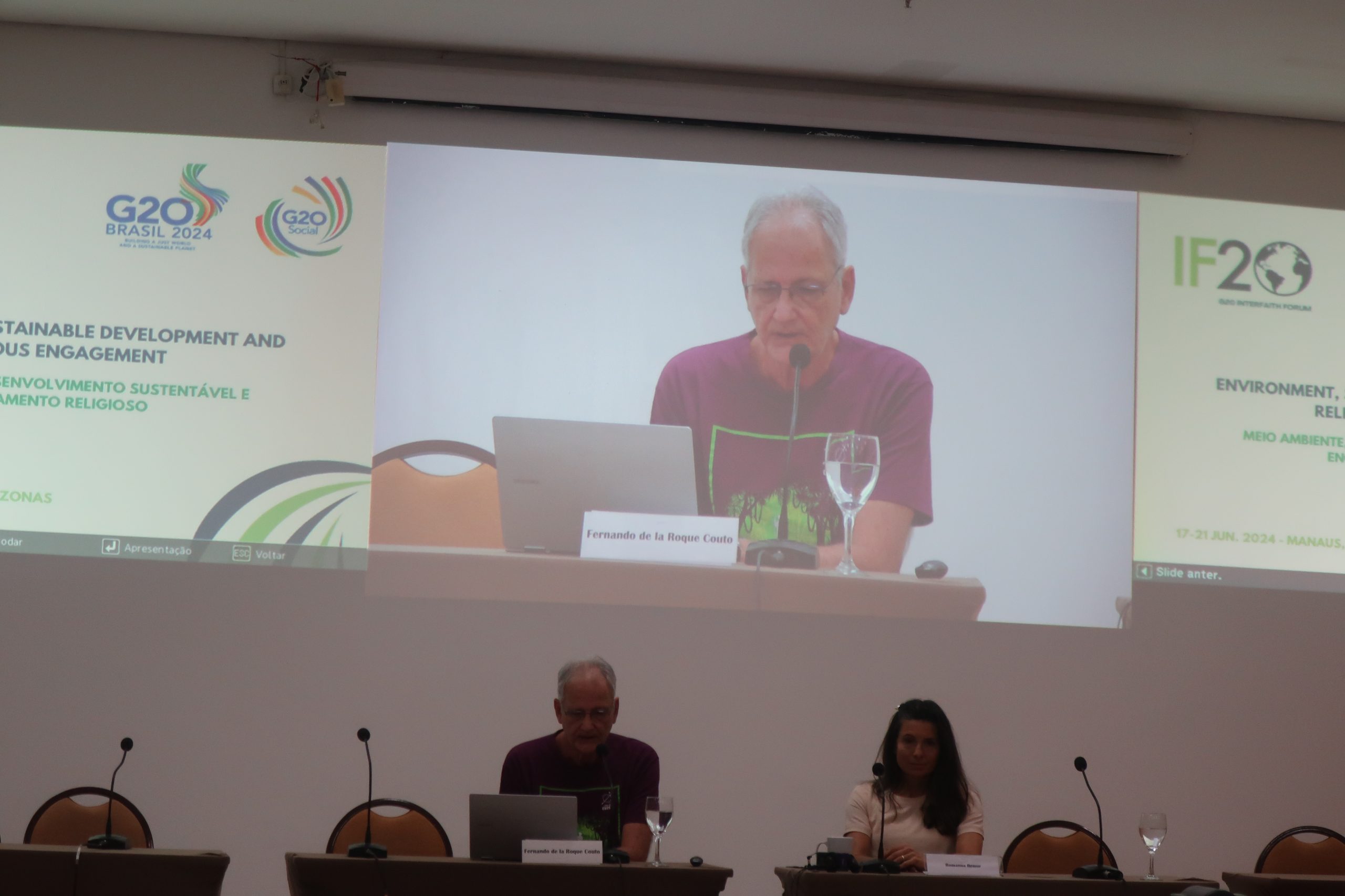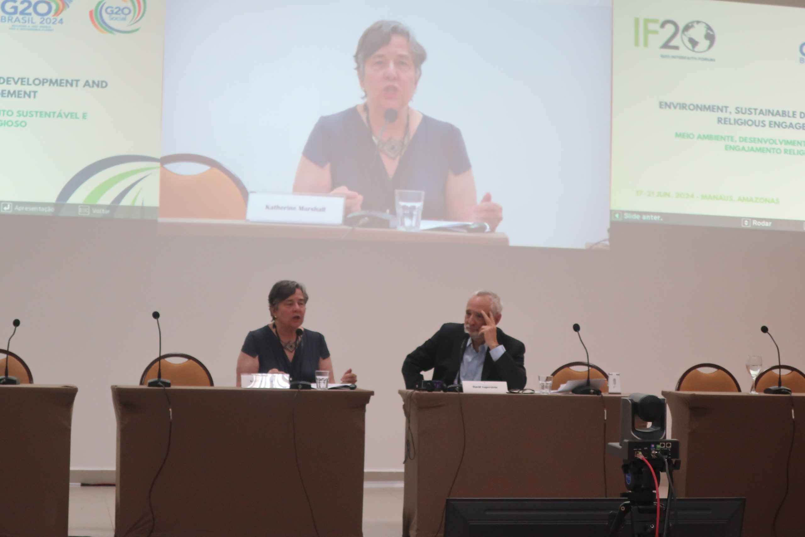 Session about education, development and intercultutural comprehension. Quézia Barreto, Aldrin Figueireido, Marianna Richardson, Magda Ricci, James Standish and Katherine Marshall, from left to right. In the picture, Katherine Marshall (Vice President of the G20 Interfaith Forum; Senior Researcher at the Berkley Center for Religion, Peace, and World Affairs, Georgetown University; Executive Director of the World Faiths Development Dialogue) is up close and speaking.