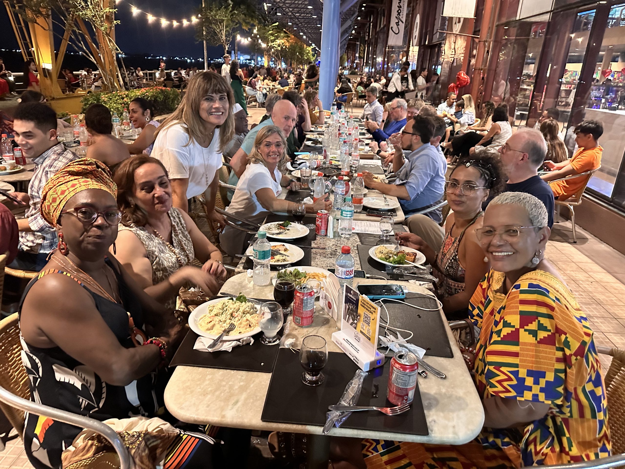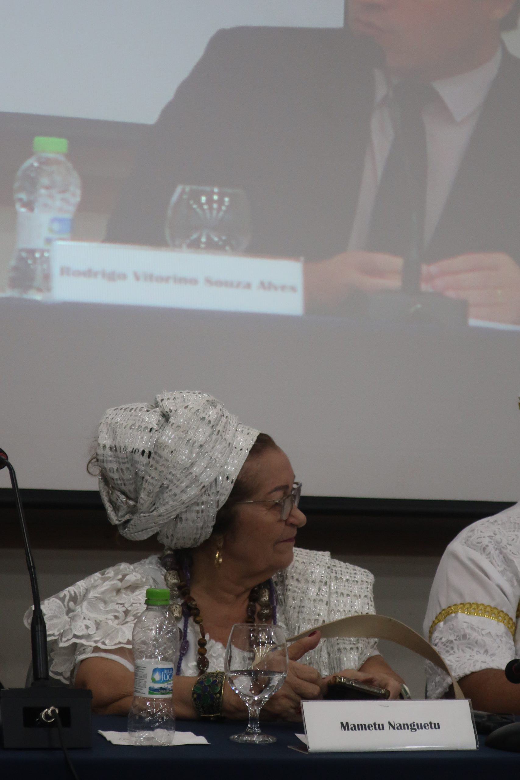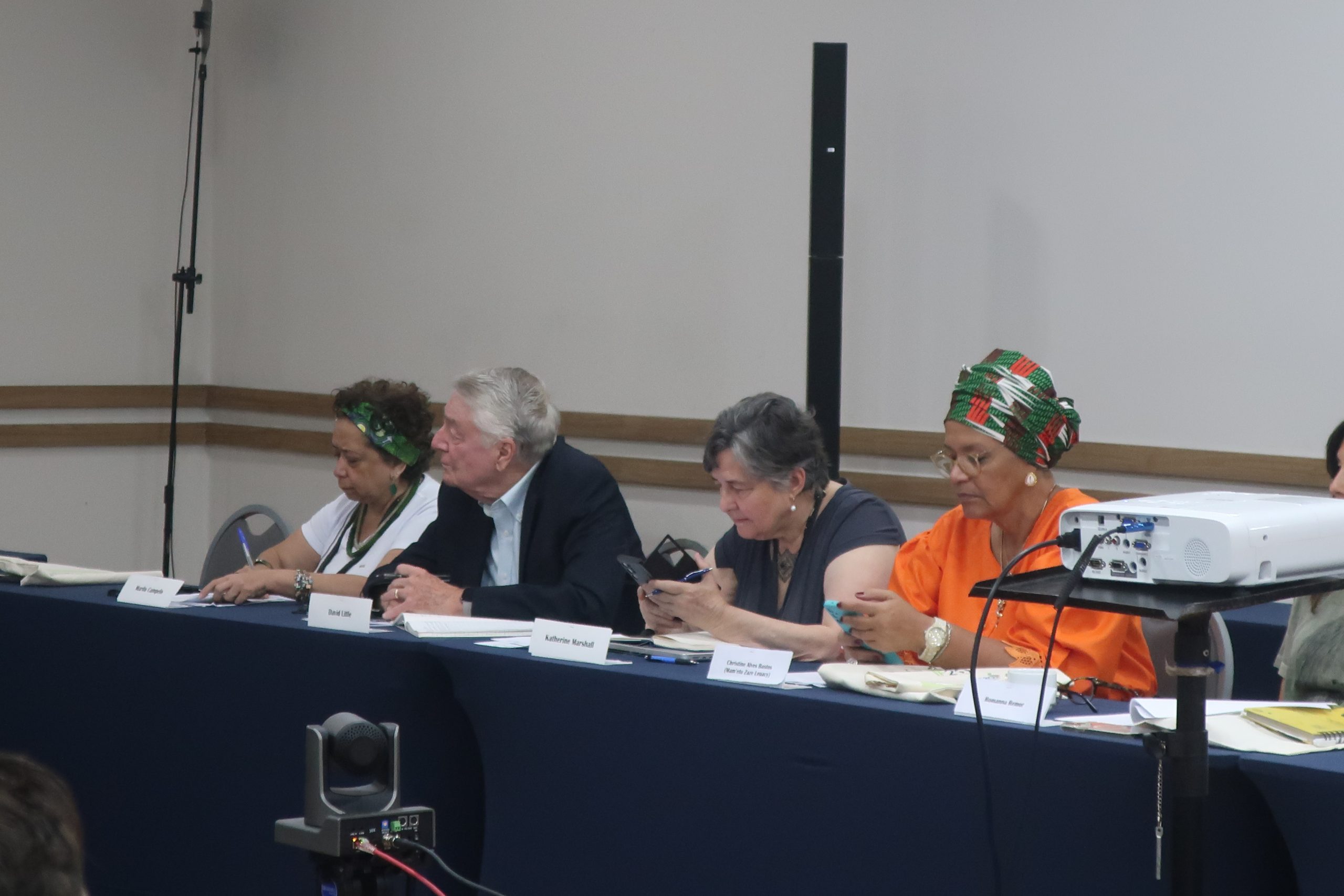 Session about education, development and intercultutural comprehension. Quézia Barreto, Aldrin Figueireido, Marianna Richardson, Magda Ricci, James Standish and Katherine Marshall, from left to right. In the picture, Katherine Marshall (Vice President of the G20 Interfaith Forum; Senior Researcher at the Berkley Center for Religion, Peace, and World Affairs, Georgetown University; Executive Director of the World Faiths Development Dialogue) is up close and speaking.